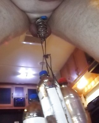 4 botellas de agua colgando de mi polla