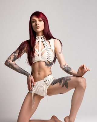 La sexy chica alternativa Adora se desliza por sus bragas rojas y blancas en el sofá