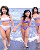 Chicas asiáticas en bikini retozan y tontean en la playa