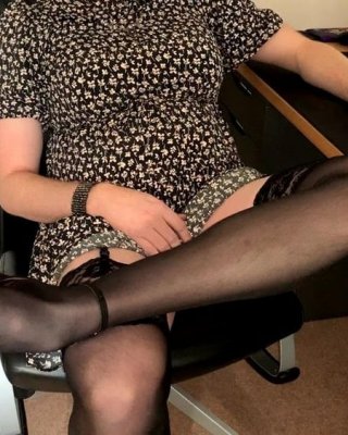 La secretaria pervertida se despoja de su elegante vestido negro y de sus bragas transparentes y posa sólo con sus medias moradas.