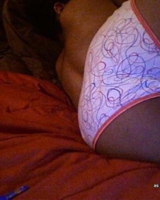Nena regordeta de ébano en bikini exponiendo sus tetas y abriendo sus piernas