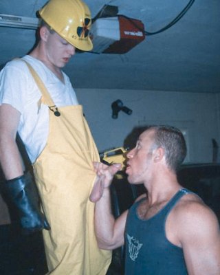 Dos mecánicos de automóviles mutuamente chupando y follando en un viejo garaje