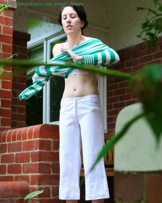 La pelirroja flora se viste al aire libre después de una sesión de modelaje desnudo