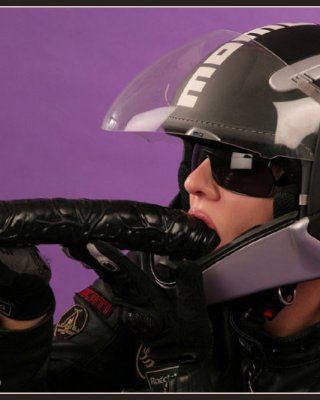 Mujer flexible en un casco que se rellena con un enorme consolador negro