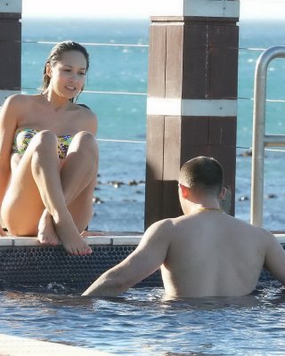 Myleene klass con un bikini con estampado de flores en la piscina en sudáfrica