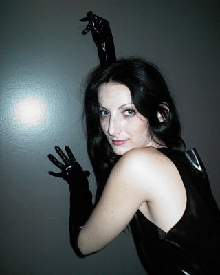 Pálido gótico aficionado en látex muestra su anillo del clítoris