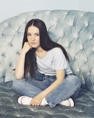 Rubia desnuda mostrando sus pequeñas tetas y su coño afeitado con las piernas abiertas
